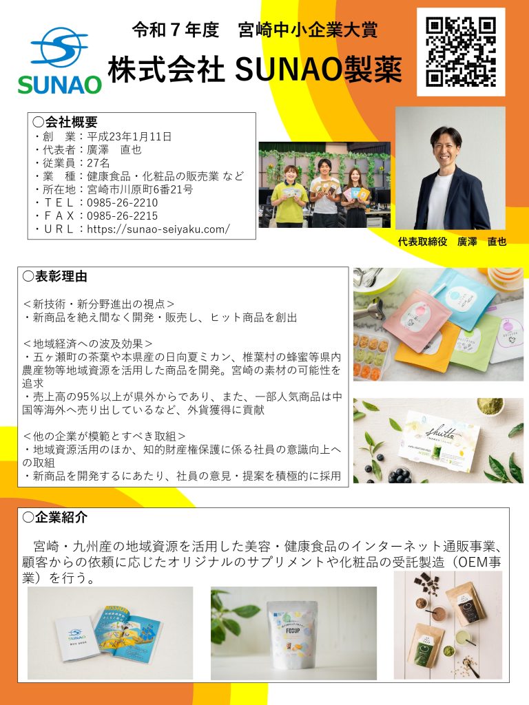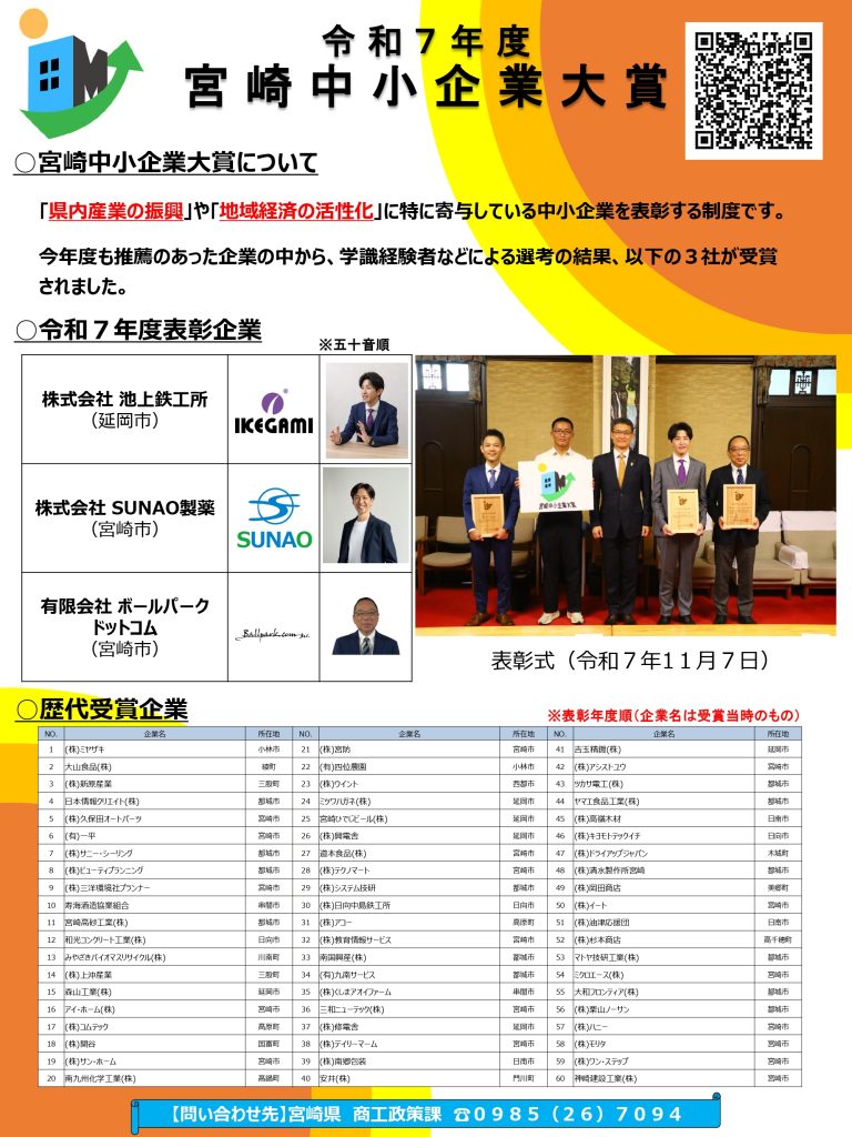 | 展示内容 | 宮崎県では、県内産業の振興や地域経済の活性化に寄与するなど特に優れた中小企業を「宮崎中小企業大賞」として表彰しています。今年度は、11月7日に知事表彰式が行われ、3社が大賞に決定しました。各大賞企業の取組をご紹介します。 ◆令和7年度 宮崎中小企業大賞表彰企業 ・株式会社池上鉄工所 ・株式会社SUNAO製薬 ・有限会社ボールパークドットコム |